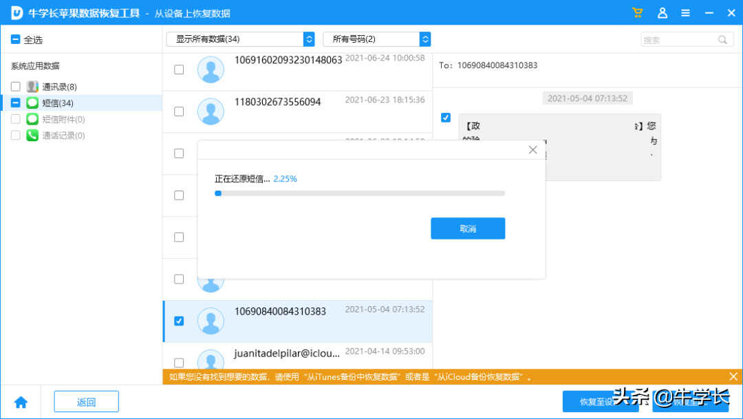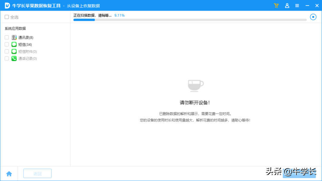 演示使用的是牛学长苹果数据恢复工具,不仅支持短信、通讯录、照片等本机数据的找回,还支持微信相关数据的恢复。