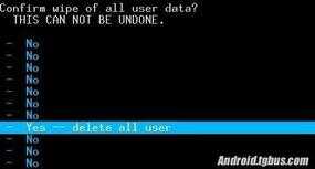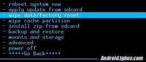 4、选择【wipe data/factory reset】(中文版的是:清空所有数据,也就是恢复出厂设置了),然后按开机键确认,再选择【yes - delete all data】(是的 - 清空所有数据)即可