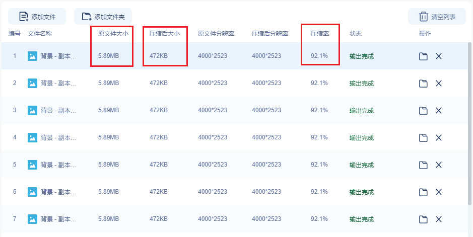 ④等待所有图片批量压缩完成,就可以看到每张图片压缩后的大小了,分辨率保持不变,画质就不会降低,压缩率相当高。