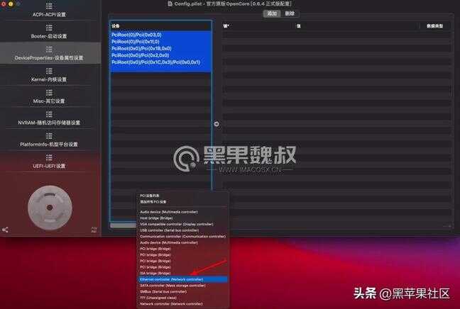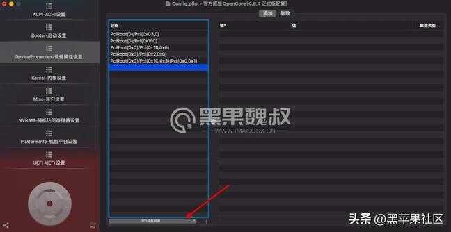 第一步:用OC引导配置工具,打开自己的config.plist,找到图示位置,点击PCI设备列表,添加Ethernet开头的有线网卡设备信息。