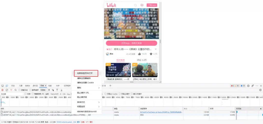 4.播放视频,会发现网页缓存文件查看窗口有缓存文件出现,选中缓存文件,鼠标右键选择【在新标签页中打开】;