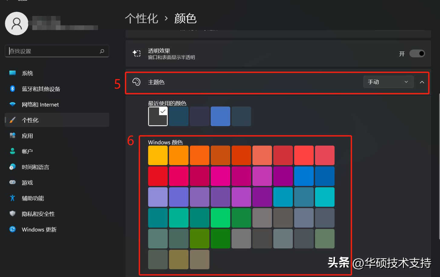 3, 在窗口主题色中,您可以选择让Windows自动从我的背景选择主题色⑤,或是自行发挥色彩创意⑥。