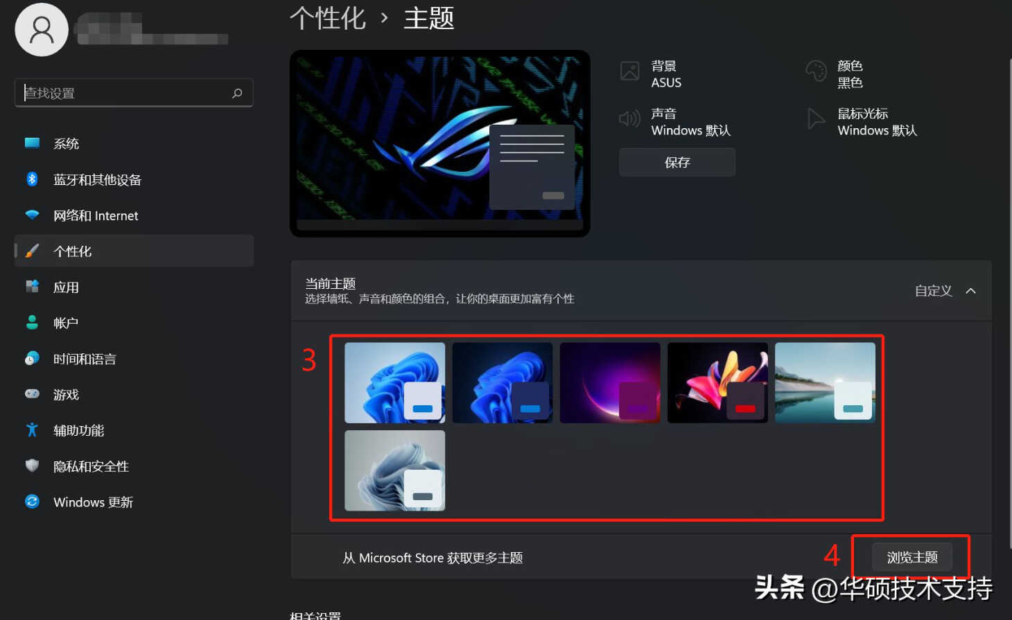 2, 在主题中,您可以点选Windows内建的主题③,或是点选[浏览主题]④以从Microsoft Store探索各式各样新颖好看的主题来个人化您的计算机。