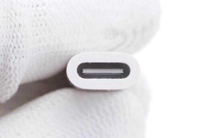 Lightning 接口端子内部与 iPhone 充电接口设计相似,支持正反盲插;端口两侧均印有转接器的型号以及苹果名称字样。