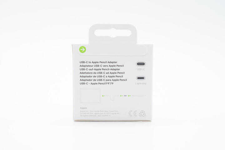 苹果转换器的包装一如既往,白色简约设计风格,左上角印有USB-C to Apple Pencil 字样。