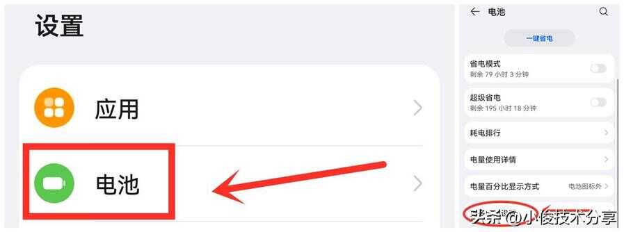 此时,同样打开手机设置页面,然后选择【电池】设置开关,把它打开,接着点击【更多电池设置】