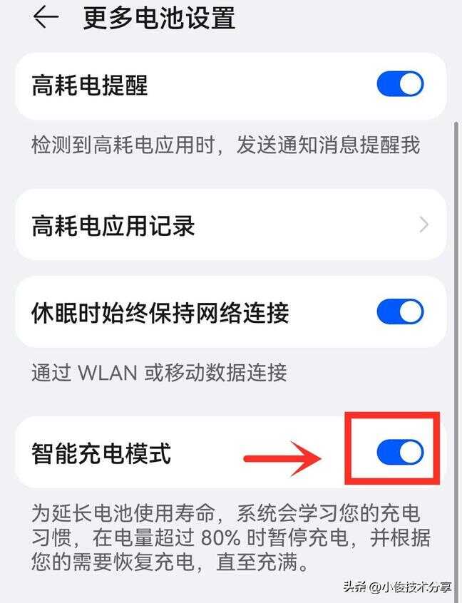 在【更多电池设置】中,我们直接把【智能充电模式】开关打开!