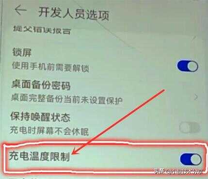 接着我们往下就会看到一个【充电温度限制】的开关,那么此时呢,我们要把这个开关打开,打开这个开关之后,我们在给手机充电时,就不会出现发热发烫的问题了!