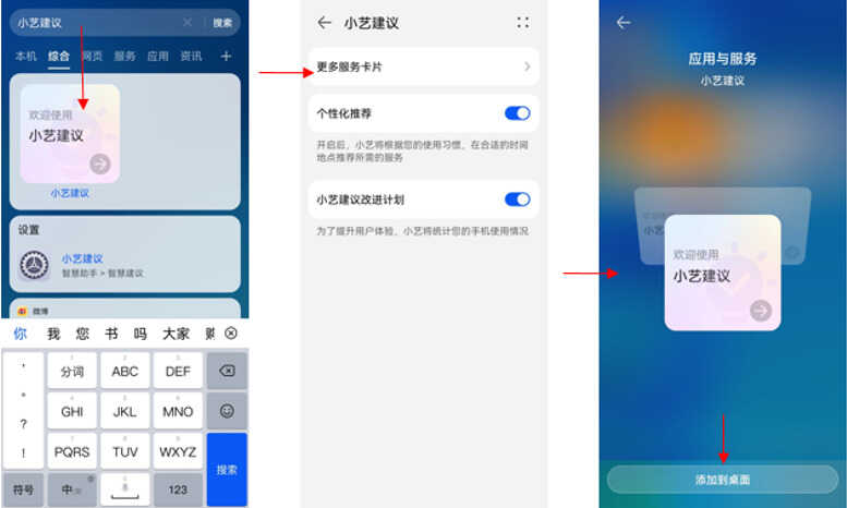 方法二:桌面下拉>全局搜索>输入“小艺建议”>点击图标进入设置项>点击“更多服务卡片”>“添加到桌面”,重新添加。