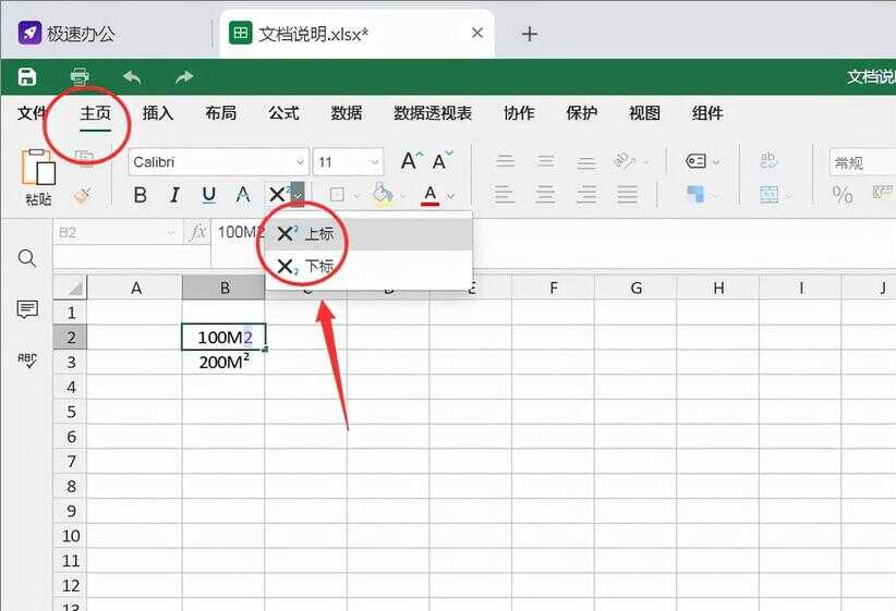 3、“主页”菜单中找到“上标/下标”直接单击就成功设置上标了,或者是单击“上标/下标”的下拉选项,选择对应的“上标”或“下标”进行设置即可。