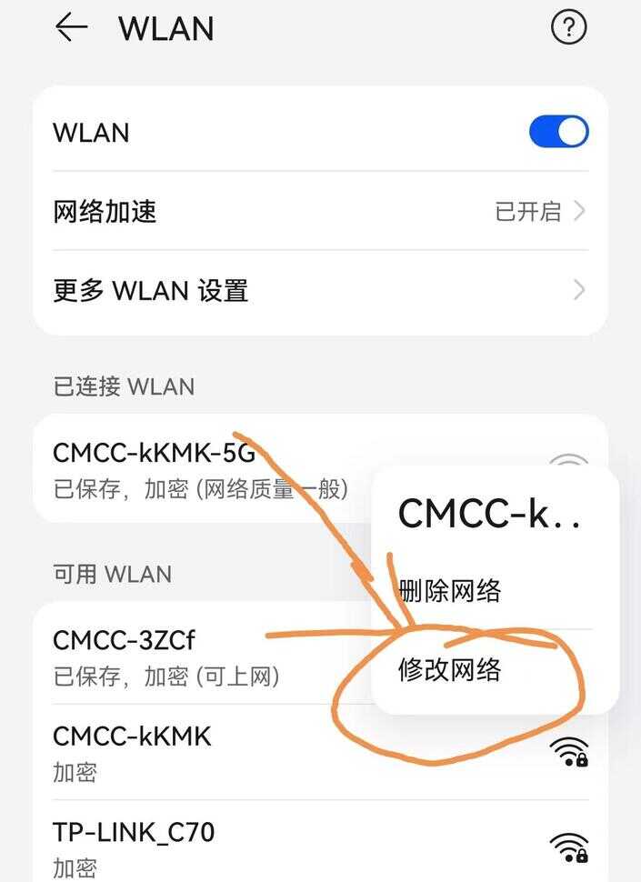 第二步,手指长按WiFi账户,3秒后会弹出一个下拉菜单,找到修改网络,点击修改网络,页面就会跳到如下页面: