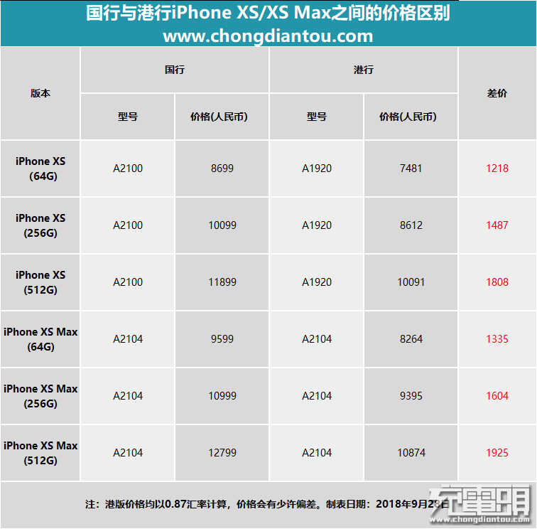 按照今天(9月28日)0.87的汇率来看,港行iPhone XS(64GB)的价格约为7481元人民币,相比于国行可便宜了1200左右,而512GB版本的更是便宜了1800左右。而iPhone XS Max的话,就更夸张了,最高可相差到近2000块。
