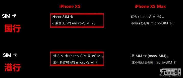 如图,国行与港行的iPhone XS Max都采用的是双Nano-SIM实体卡,国行iPhone XS只支持一张Nano-SIM实体卡,港行iPhone XS支持一张Nano-SIM实体卡和一张eSIM虚拟卡。