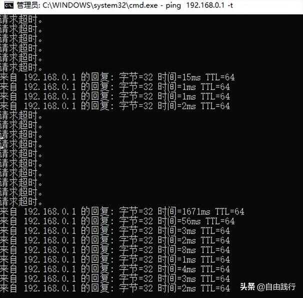 然后怀疑是电信的问题,但当电脑卡的时候,手机仍然很流畅。打开电脑的cmd,开命令行窗口:ping 192.168.0.1 -t,发现丢包严重。内网连路由都丢包,跟电信就没关系了。