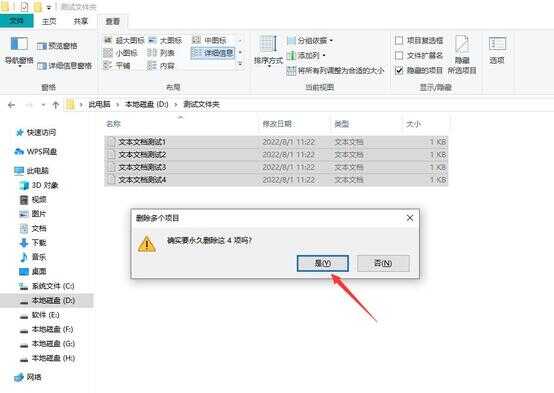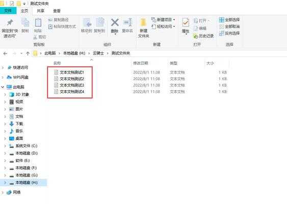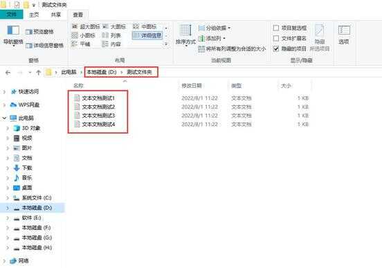 首先我们在D盘路径下新建一个文件夹并命名(测试文件夹),命名以后在文件夹里放置多个txt文本并分别命名(文本文档测试1,文本文档测试2,文本文档测试3,测试文本文档4)。