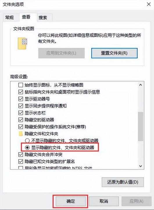 滑动右侧按钮,找到【显示隐藏的文件、文件夹和驱动器】,勾选好并点击确定按钮。