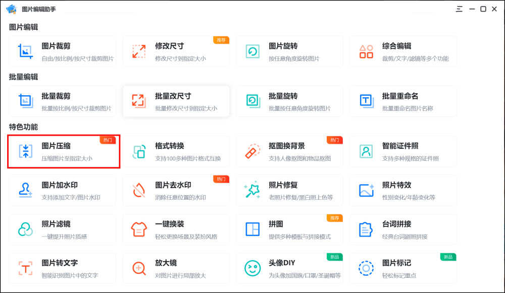 第一步:打开电脑上的软件,进入软件的首页,点击选择【特色功能】-【图片压缩】选项。