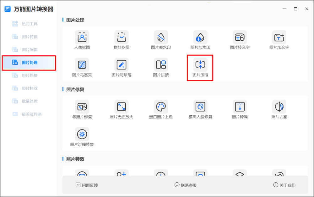 第一步 打开电脑上的软件,进入软件的首页。点击选择【图片处理】-【图片压缩】选项,并且上传需要压缩的图片文件(有多个图片,直接上传文件夹。)