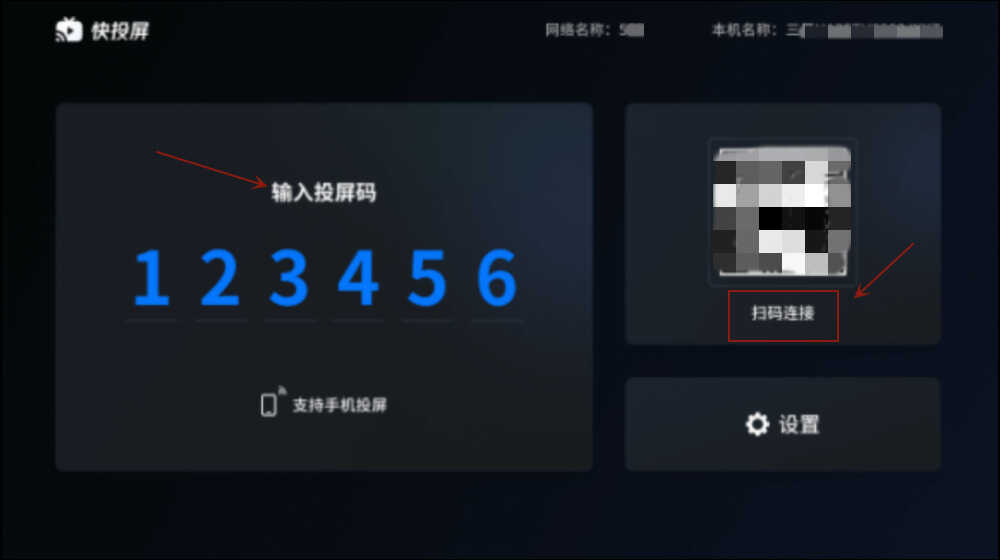 第二步:从电视的应用列表中找到【快投屏】并打开,在当前页面中,我们可以看到当前电视中的投屏二维码以及六位数字投屏码,不管是输入投屏码还是扫描二维码,均可完成投屏操作。