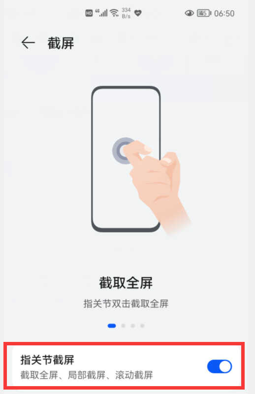 这个方法是我比较喜欢的一种截屏方式,只需要用单指的指关节,在手机屏幕上轻轻敲击2下,就可以快速给手机屏幕截屏。不过,在使用之间,需要在手机设置里开启这个功能。打开手机设置,点击“辅助功能”,再点击“快捷启动及手势”,再点击“截屏”,打开“指关节截屏”的开关,然后就可以双击截屏了。