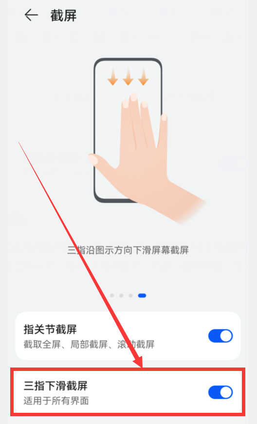 这种截屏方式,应该是我最喜欢的一种截屏方式了,只需要用3个手指的指肚,在手机的屏幕上,从上到下轻轻地滑动一下,就可以快速截屏。不过,这种方法,在一些比较老的华为手机上,是没有的。同样的,要想使用这种方法,我们需要在手机的设置里,开启“三指下滑截屏”的开关(如下图)。