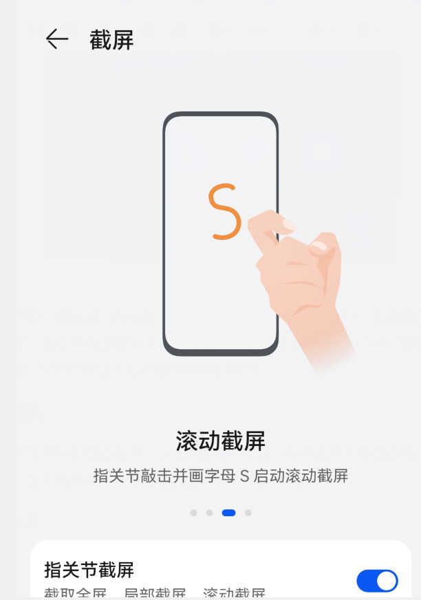 用手指的指关节在手机的屏幕上,从上到下画一个S,就可以对手机屏幕进行滚动截屏(或者叫长截屏)。这个功能对于页面比较长的网页,就非常有用了。同样,这种截屏方式也是需要打开指关节截屏开关,才能使用的。