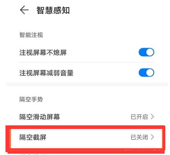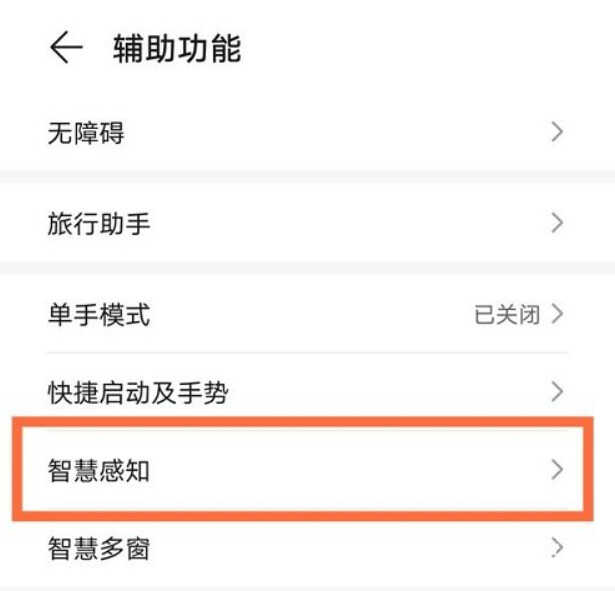 要想使用隔空截屏,也是需要先开启它。打开手机设置,点击“辅助功能”,再点击“智慧感知”。