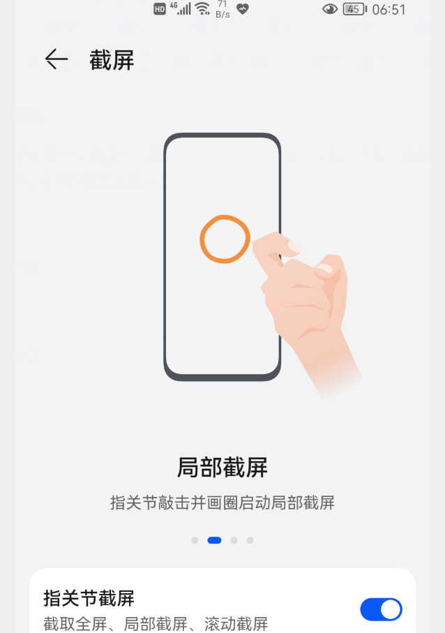 华为手机的局部截屏功能很强大,可以截取任意形状,如:心形、手形、圆形、菱形等等,当然,这种截屏方式也是需要开启指关节截屏功能的。用手指的指关节,在手机屏幕上画一个圈。
