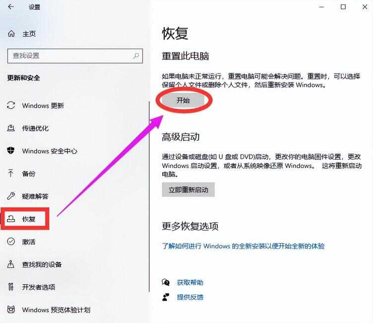 在打开的新页面里,先点击左边更新和安全下面的“恢复”选项,再点击右边恢复重置此电脑下面的“开始”按钮;