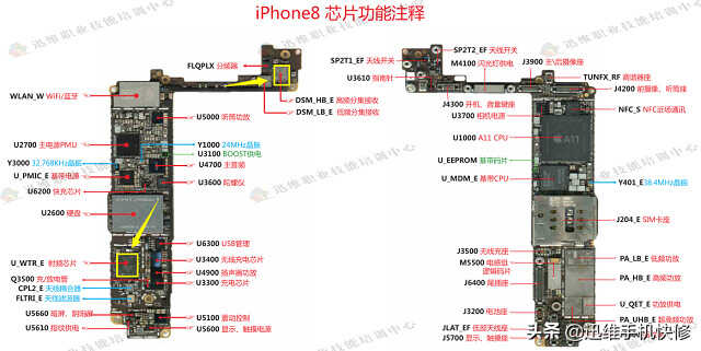 iPhone8手机有两个地方容易损坏:高低频分集器和射频芯片,出现问题都会导致手机无服务。