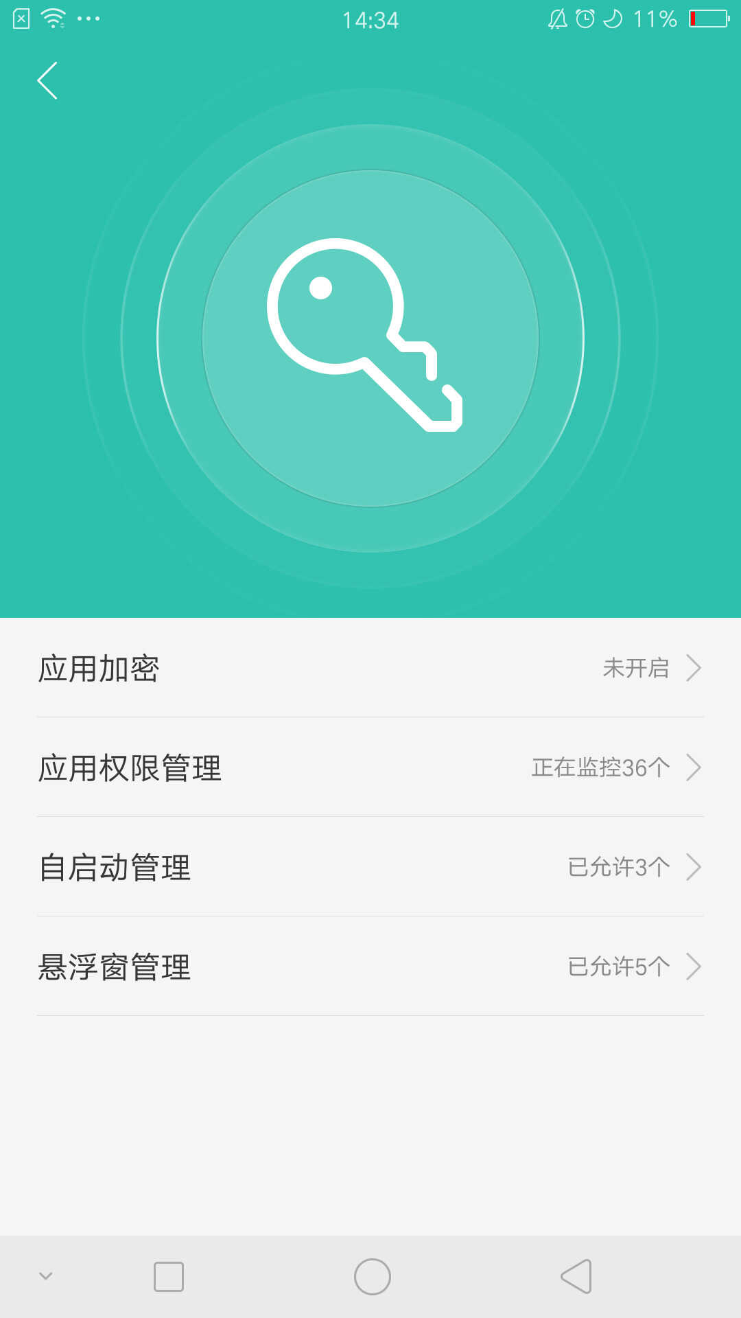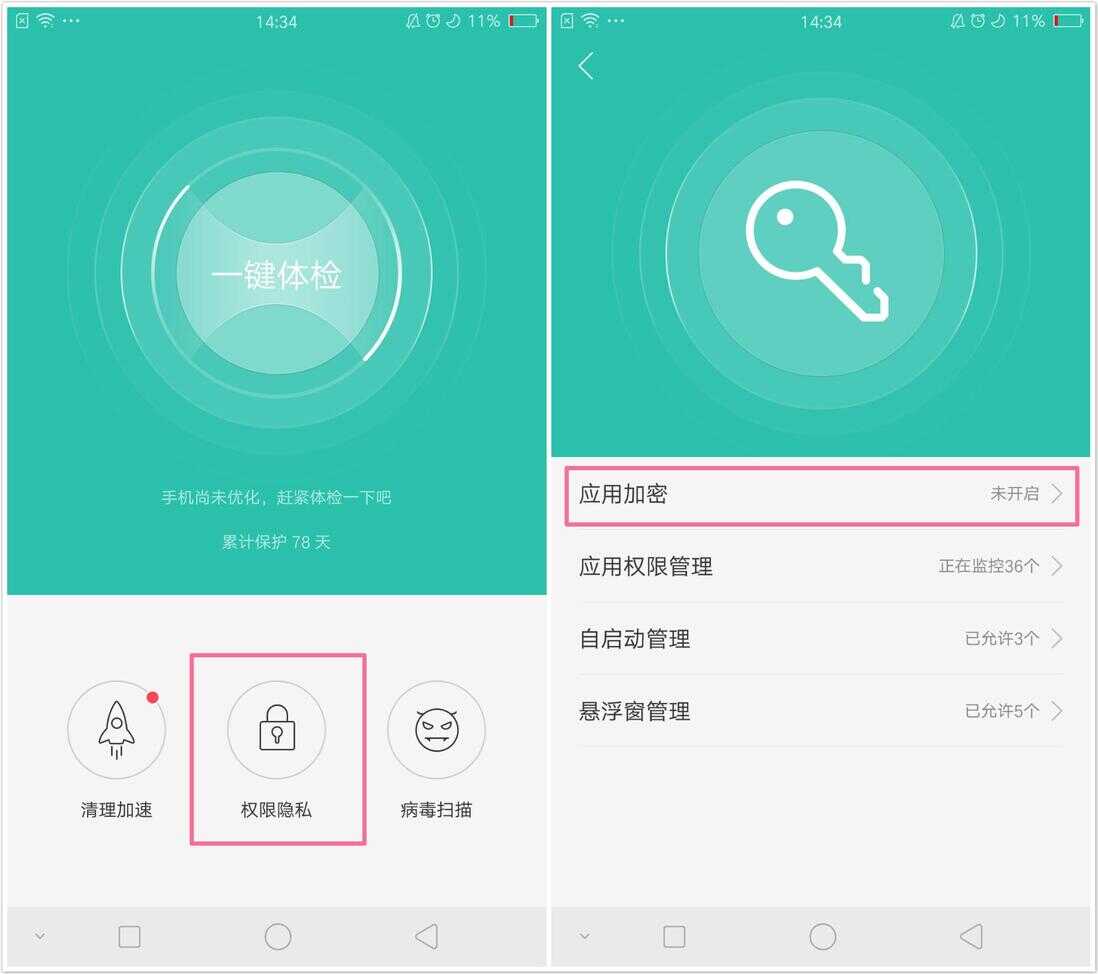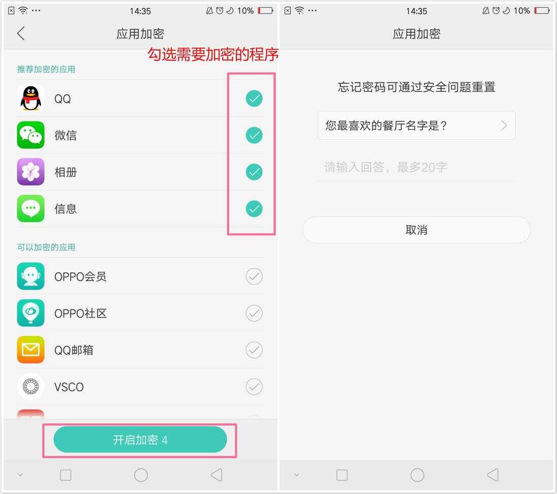步骤:手机管家--权限隐私--应用加密,设置应用加密时会自动提示设置安全问题。