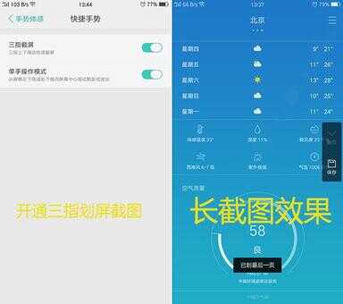 四、截图功能:OPPO R9s的普通截图同时按下电源键和音量下键就可以了,另外,还有三指划屏截图法,三只手指同时向下滑动屏幕即可完成截图;除此之外,还新增了长截图,同时按住电源键和音量上键就可以了,只要同时按下电源键和音量上键就可以选择截屏的页数,截到你满意为止。