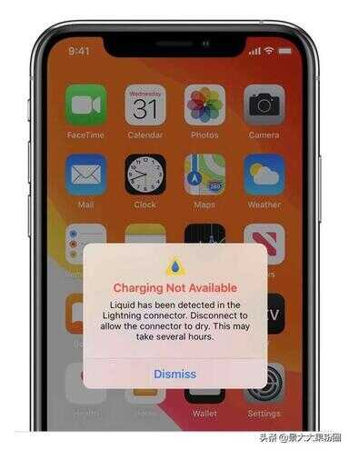 当您的配件USB连接到iPhone的时候,如果检测到有液体,那么也会弹出来这条提示,用以提醒你。
