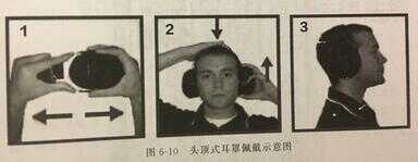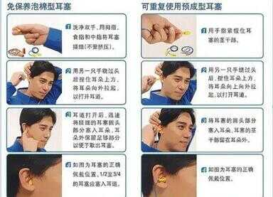 佩戴耳塞时,一边用耳朵同侧手将耳塞压扁、柔细,一边用对侧手从头的后方向上、向外拉耳廓,尽量把耳道拉直,同时用同侧手将耳塞塞入耳道,耳塞膨胀后在耳道内成型堵住耳道。
