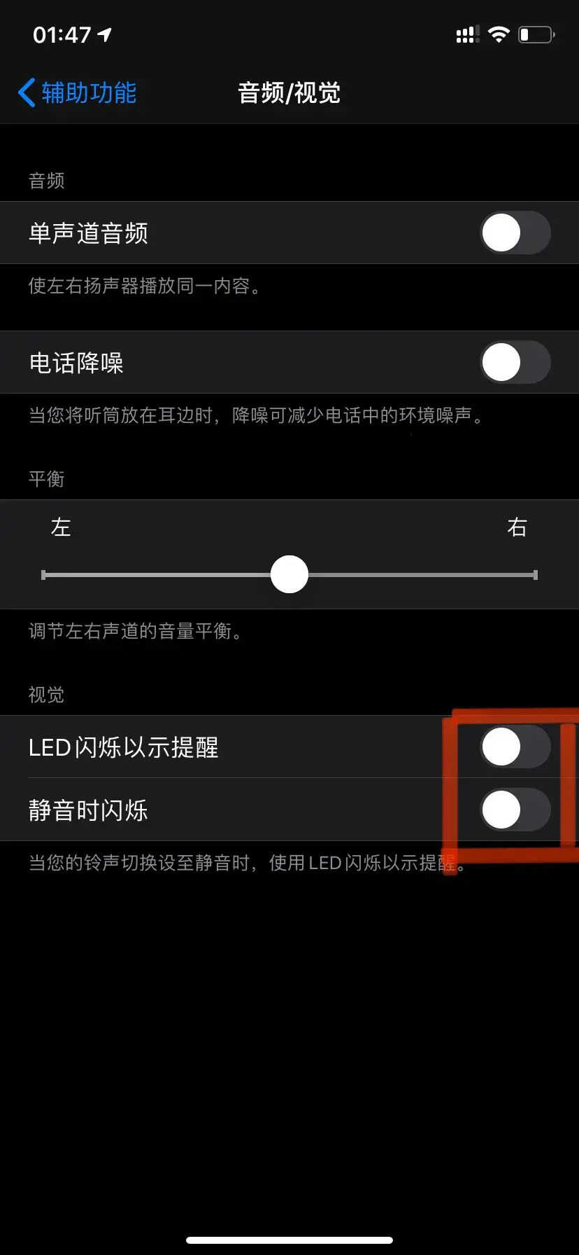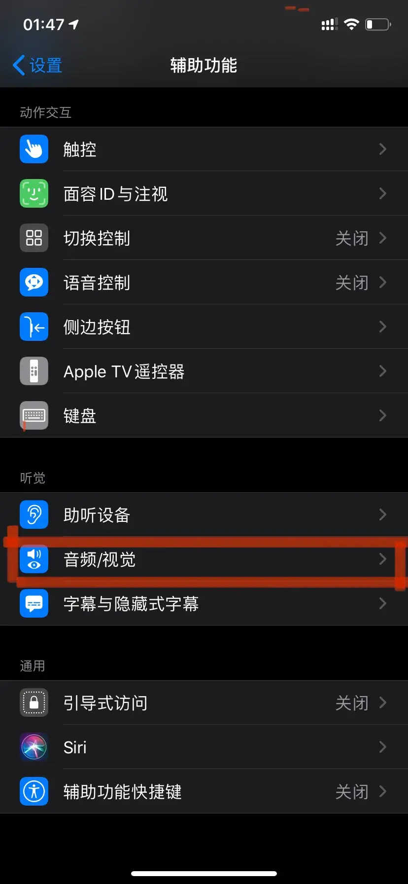 在辅助功能里面找到音频/视觉以示提醒点击打开。
