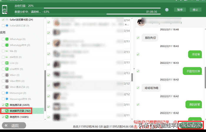 第3步:最后弹出的页面中,选择想要恢复的聊天记录,随后点击【恢复】即可哦。