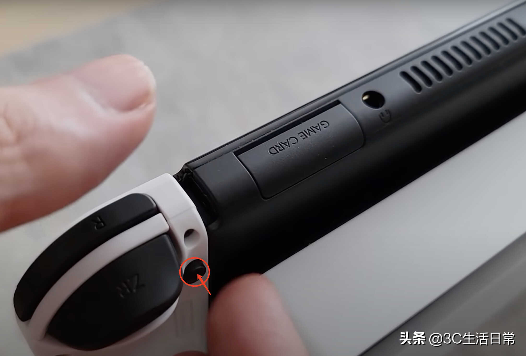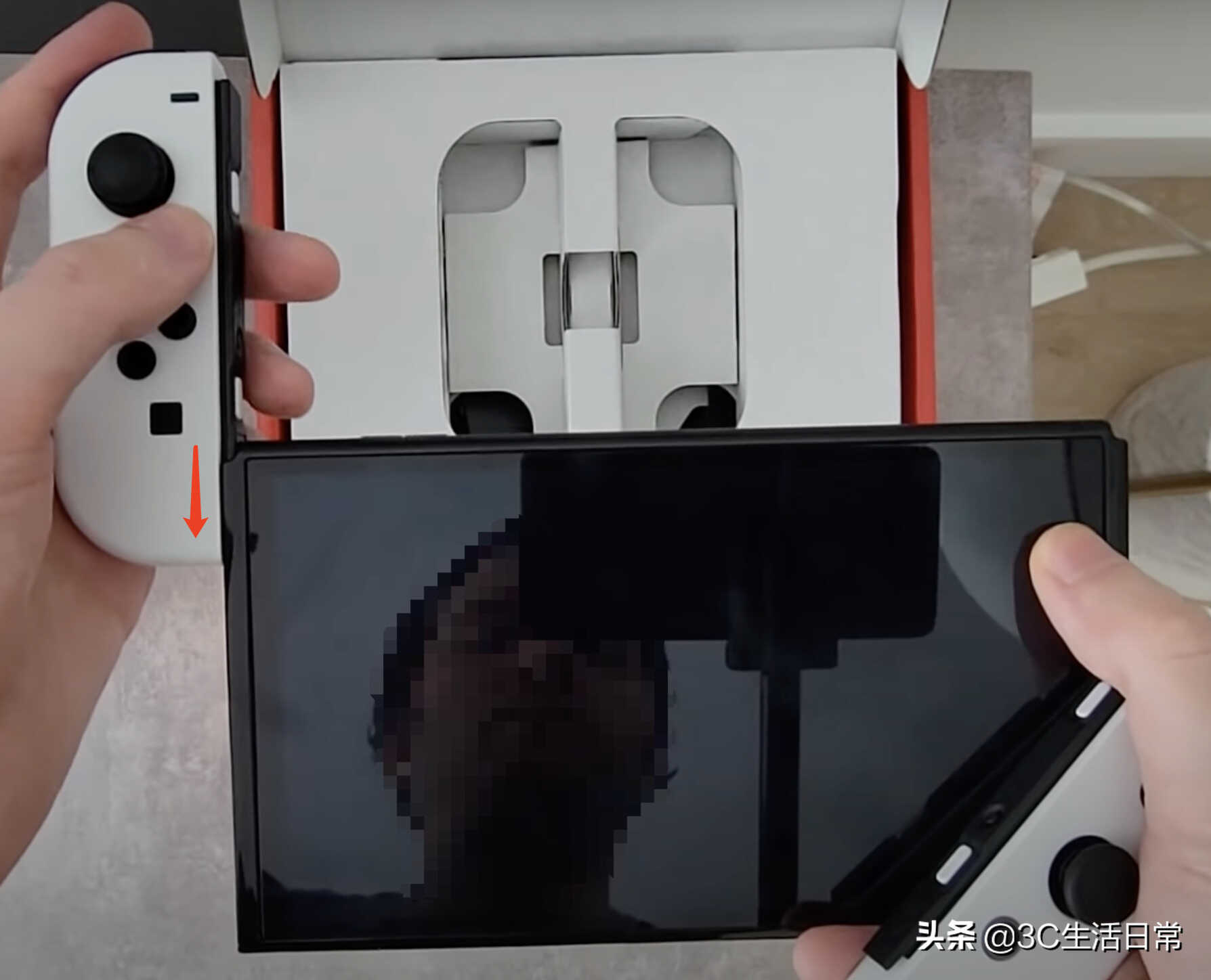 将手柄从盒子中取出,如图所示,把左边手柄对准主机的卡插,向下滑动到底,会听到卡扣的声音。右手柄的安装一致。要取下手柄,只需按住下图所示的黑色按钮,同时向外拉出手柄。