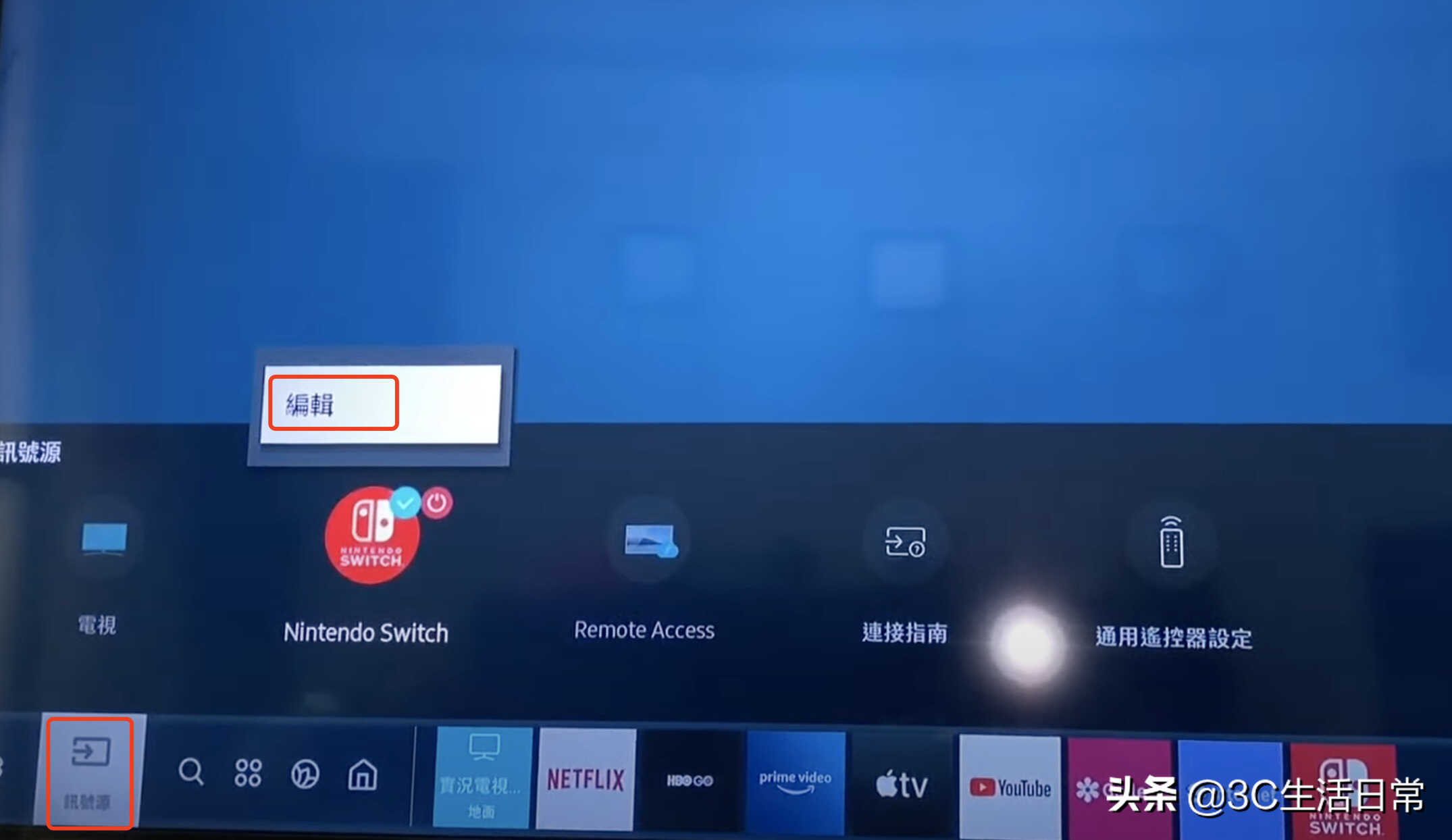 7、打开电视,选择“信号源”,如果第4步连接的是HDMI 1端口,这边“信号源”就选择HDMI 1。正常信号源匹配好了,电视就会显示switch主机的内容。