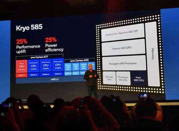 骁龙865采用7nm工艺,CPU采用了Kryo 585核心,并且也是1个超级核心(2.84GHz)+3个性能核心(2.4GHz)+4个能效核心(1.8GHz)设计。其中超级核心与性能核心采用Cortex-A77架构,而能效核心采用的是Cortex-A55架构。