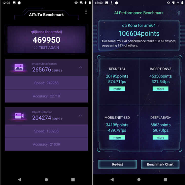 AI性能方面试用安兔兔和鲁大师的AI测试得出469950分和106604分。