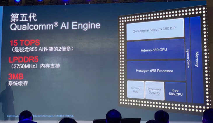 此外在AI方面,骁龙865也是搭载了第五代Qualcomm AI Engine,在AI性能上是上一代两倍,每秒可达15万亿次运算。此外Qualcomm AI Engine采用了Qualcomm® Hexagon™张量加速器(Hexagon 698 DSP)作为其核心,TOPS性能是骁龙855的4倍,同时运行能效提升35%。