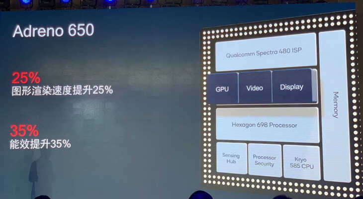 GPU部分升级为Adreno 650 GPU,在性能方面据高通说法,骁龙865的图形渲染能力相比骁龙855提升了25%,能效提升30%。除了常规的性能升级,Adreno 650 GPU支持全新的硬件嵌入特性:Adreno HDR快速混合。针对重度混合游戏场景在部分操作中性能比骁龙855提升了两倍。