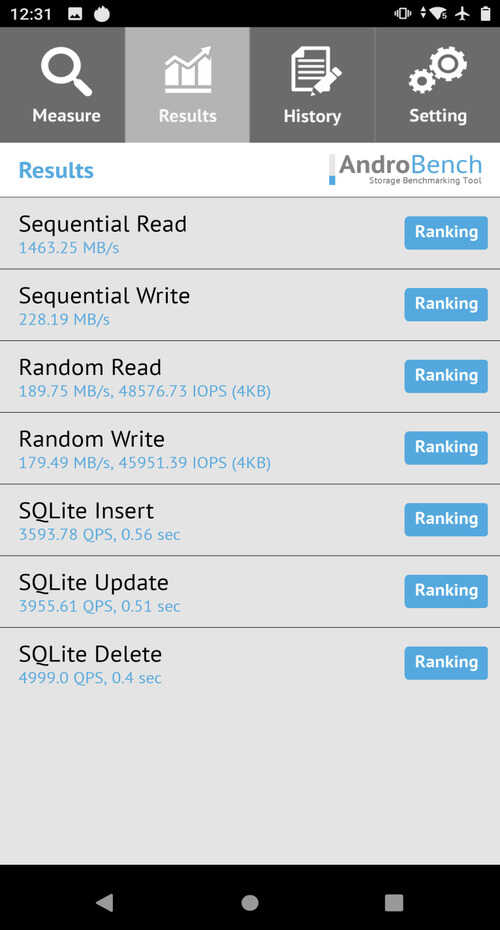 Androbench是针对存储性能进行测试,骁龙865测试机测试结果如下。