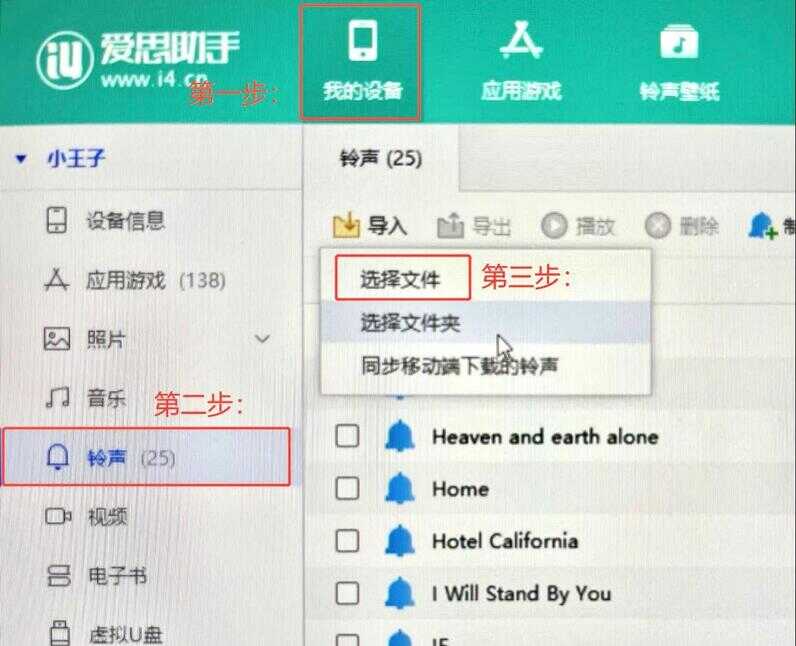 第三步:在显示区域中上部位找到“导入”选项按钮,单击一次,会弹出下拉窗口,你会看到三个选项“选择文件”、“选择文件夹”和“同步移动端下载的铃声”,这里我们选第一个“选择文件”,单击后找到你准备好的铃声,选中并单击确定导入,软件会自动导入。