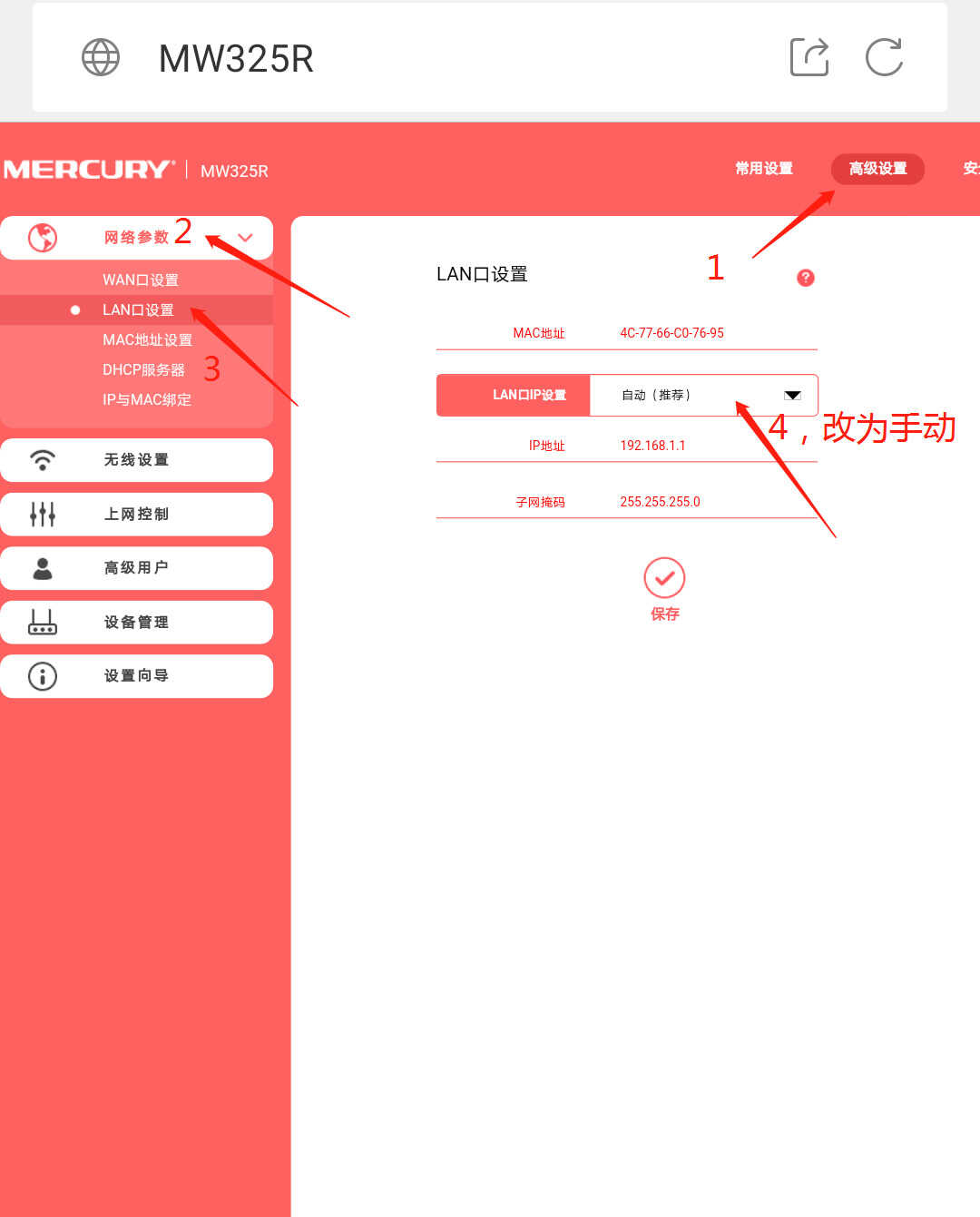 7、更改路由器的IP地址:一般家里都会用一1个以上的路由器,那么就会用户路由级联,那么需别路由器之前的IP地址不能一样,虽然路由器有自动识别同一IP的设备,会自动改自己的IP地址,但以防万一,还得会改。登录主页面选【高级设置】,【网络参数】【LAN口设置】,把自动改为手动,就可以更改了!