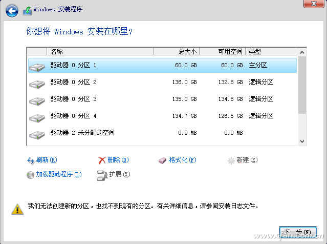 转换为GPT分区以后,再继续执行安装程序,进入分区格式化步骤以后,即可正常安装Windows 10系统,不会再出现“我们无法创建新的分区,也找不到现在的分区”的提示了。