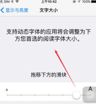 4.在苹果手机字体大小界面里可以看到有个滑块,移动滑块可以调整文字大小,如下图所示。