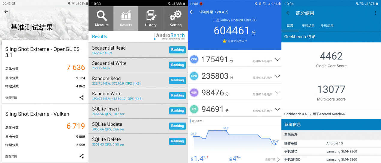 又到了大家喜闻乐见的跑分环节,最终跑分无一例外都是顶尖的旗舰水平,其中安兔兔跑分在604461分,GeekBench 4单核评分4462,多核评分13077,3DMark OpenGL评分7636,Vulkan评分6719,基本上都是领先骁龙865一点点的水平。