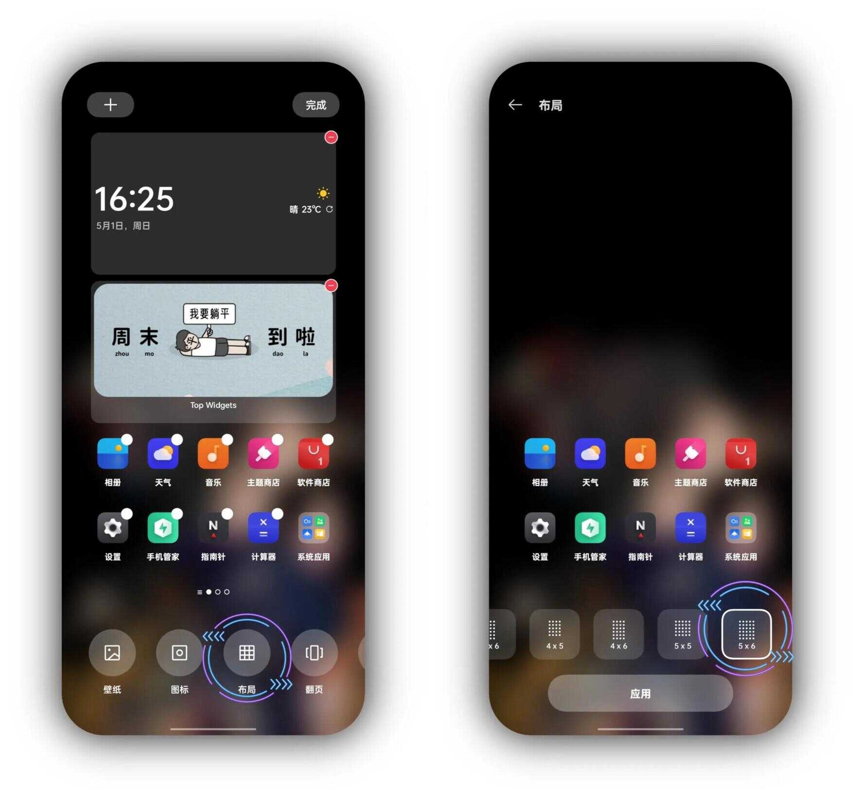设置路径:长按桌面空白处或双指向内侧滑动→布局→选择布局格式→点击应用,即可。