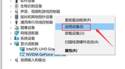4、进入显示适配器,右键单击N卡,选择启动设备,如下图所示